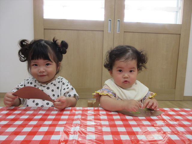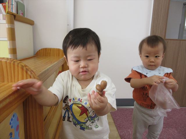 初めて見るどんぐりに興味津々👀感触を確かめたり、振って音を鳴らしてみたりと楽しんでいました(*^^*)
