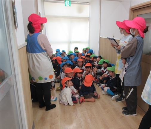 戸外遊び中の子ども達はすぐさま室内へ避難し、