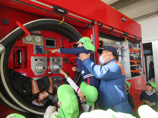 消防士さんが消防車の仕組みを丁寧に説明してくれると、興味津々な子どもたち。