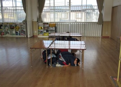 地震の放送が始まると布団を被ったり、机の下に入りダンゴムシポーズをしたりと、素早く身を守る姿勢をとれていました!