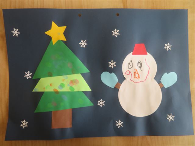 クリスマスツリーは、1枚ずつのりで貼り、指スタンプで飾りつけ♪初めて目や鼻口をペンを使って描きました。