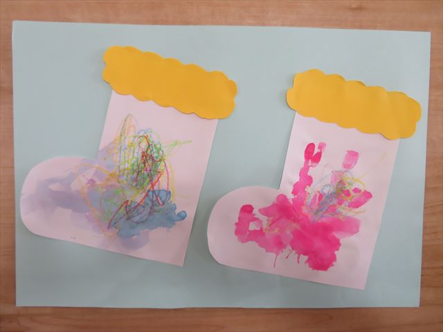 クレヨンで色を塗った後、絵の具を使って1つは、滲み絵で色の変化を楽しみながら作ったり、もう1つは、
