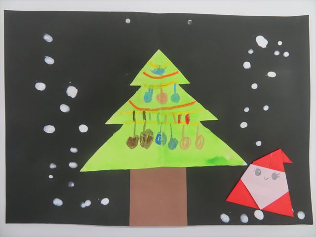 クリスマスツリーは、クレヨンで塗ってその上からはじき絵をしました!折り紙でサンタさんを作って顔を描き、