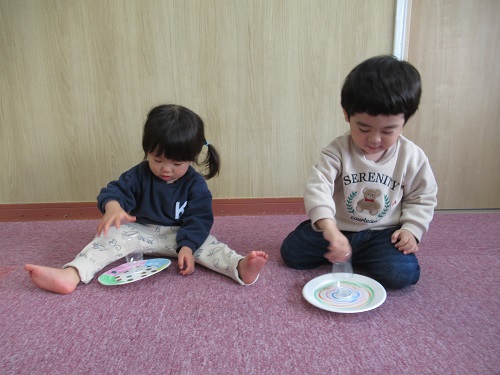 お部屋では、こま回しや福笑いを