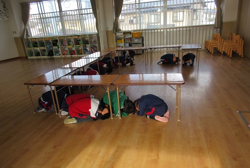 机の下や布団に入って頭を守ることが