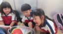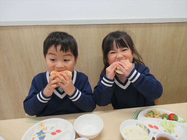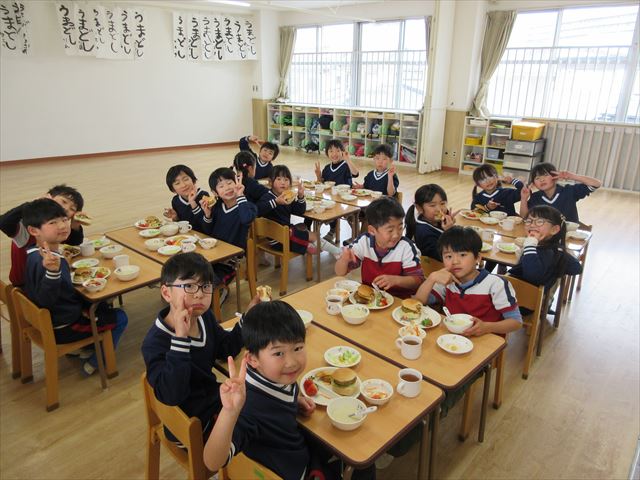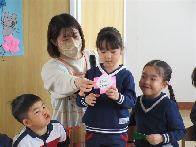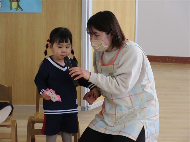 未満児さん同様、凧の裏に書いてある「好きなキャラクターは?」「好きな給食は?」の質問に元気よく答えていました!