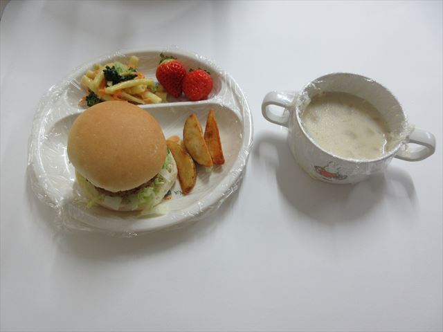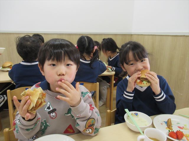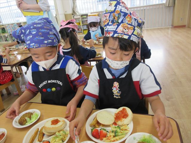誕生会の後は、こあら組・ぱんだ組はスペシャルメニューの“ハンバーガー”作り!