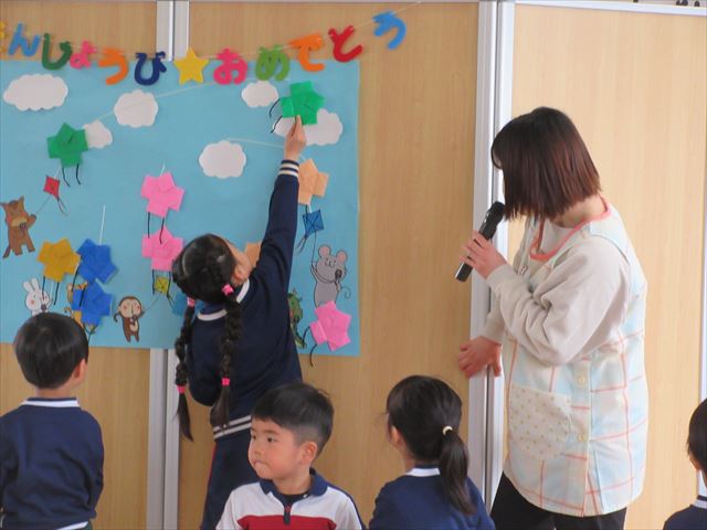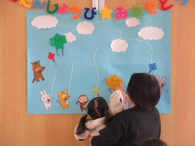その質問に答えた後は、保育士に手伝ってもらいながら、好きな場所に自分が持っている凧を飾りました✨