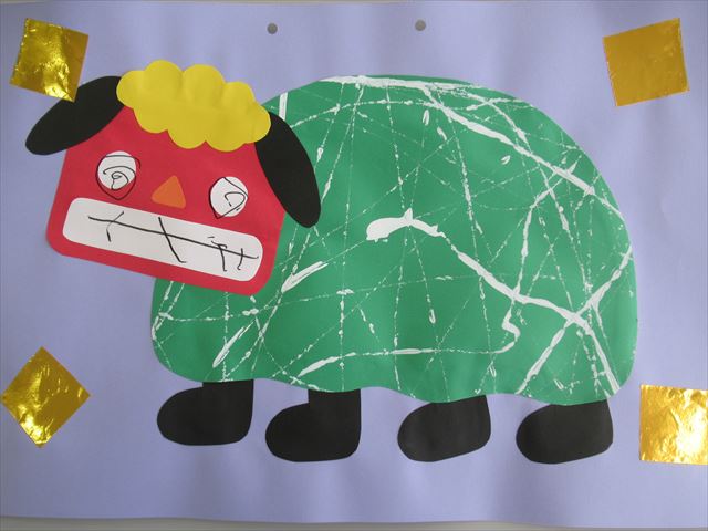 体部分は段ボールスタンプで、ぺったん!と模様を付けて獅子舞を作りました♪