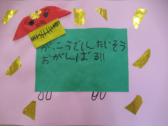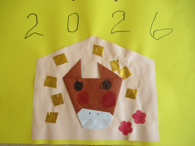 周りには金色の折り紙を切って貼り、新年らしい絵馬が出来上がりました!
