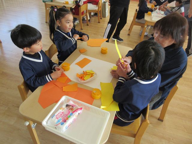 貼り絵が完成した後は、おじいちゃん・おばあちゃんに渡すレイを作りました。