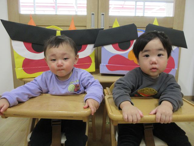 2月3日に節分会があり、ひよこ組はお部屋の中で豆まきをしました😊