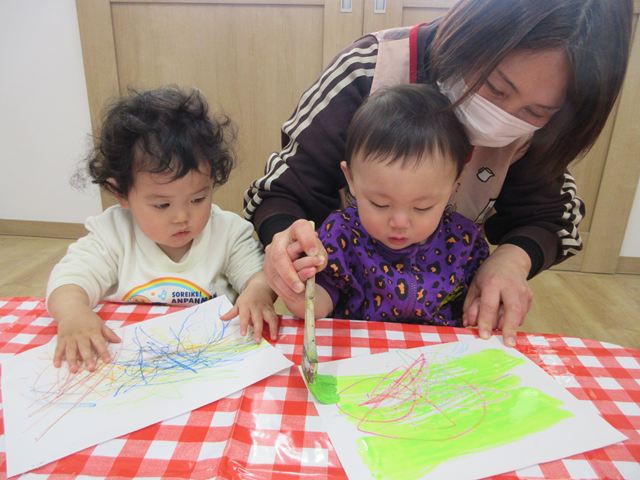 クレヨンでなぐり書きをして、その上に絵の具を塗る「はじき絵」に挑戦しました!