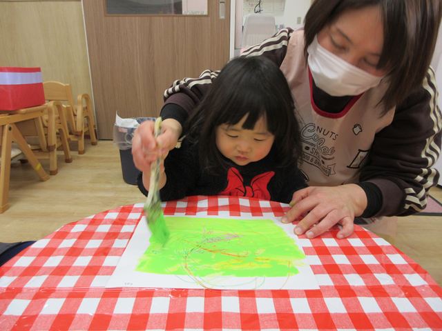 クレヨンでなぐり書きをして、その上に絵の具を塗る「はじき絵」に挑戦しました!