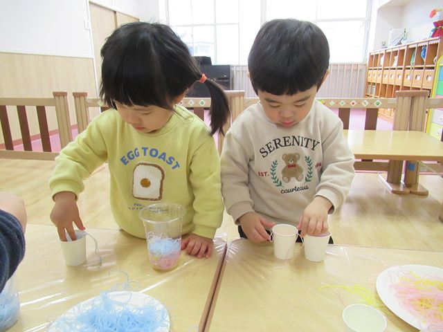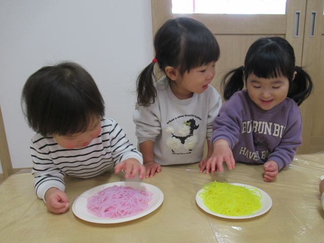 カラフルな春雨を見せると「ちゅるちゅる!」とワクワクした表情の子どもたち☺