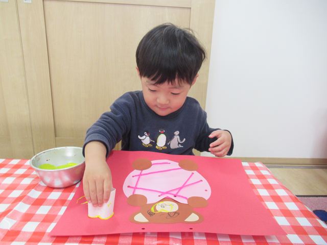 まずは今月の製作で、バレンタインにちなんで「ハートを持ったくまさん」を作りました。