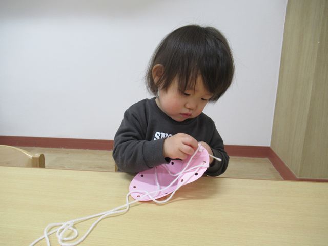 初めて毛糸通しに挑戦!保育士と一緒にしてみるとすぐにコツを掴み、