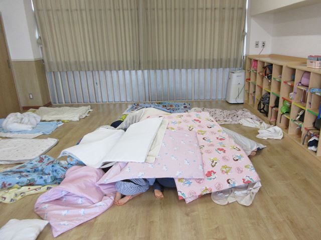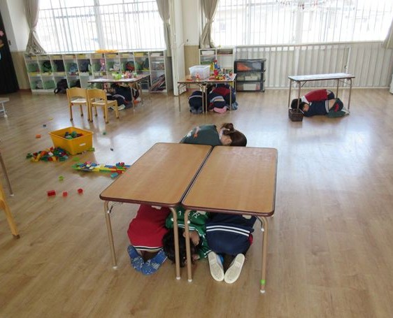 地震の音や放送・保育士の声掛けを聞いて素早く布団や机の下に隠れることが出来ていました。