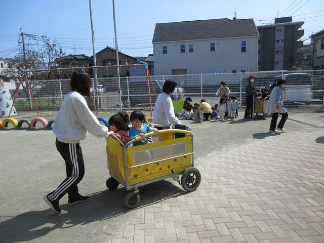 クラスごとに午睡の準備をしたり、玩具で遊んでいるときに訓練が始まりました!