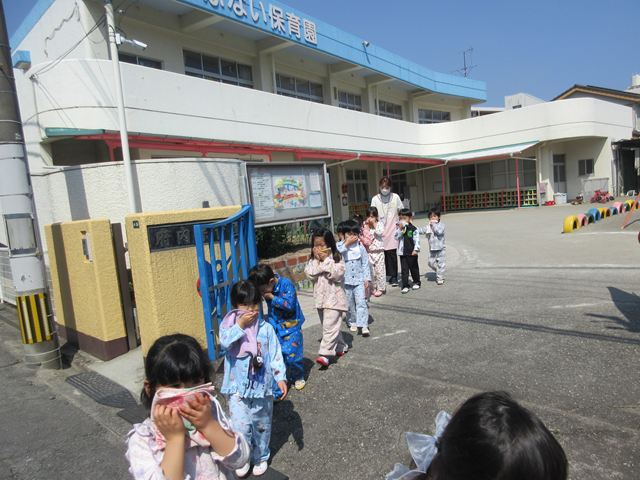 二階のクラスはスロープから、一階のクラスは各部屋から避難場所まで向かいました!