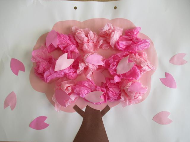 お花紙を沢山丸めて桜の木を作りました!