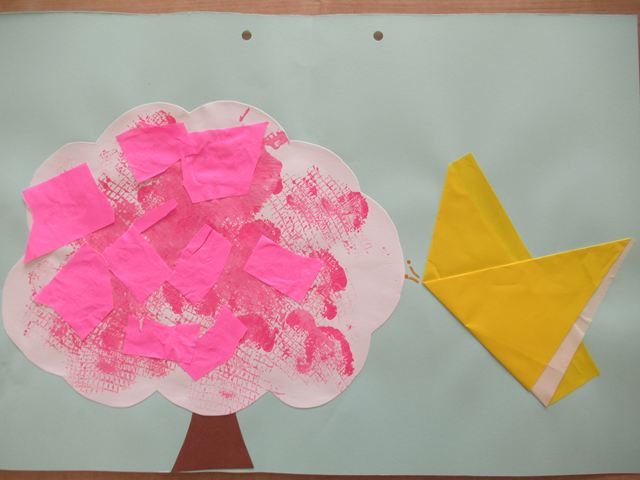 タンポスタンプで木に色を付けて桜の木を表現しています🌸